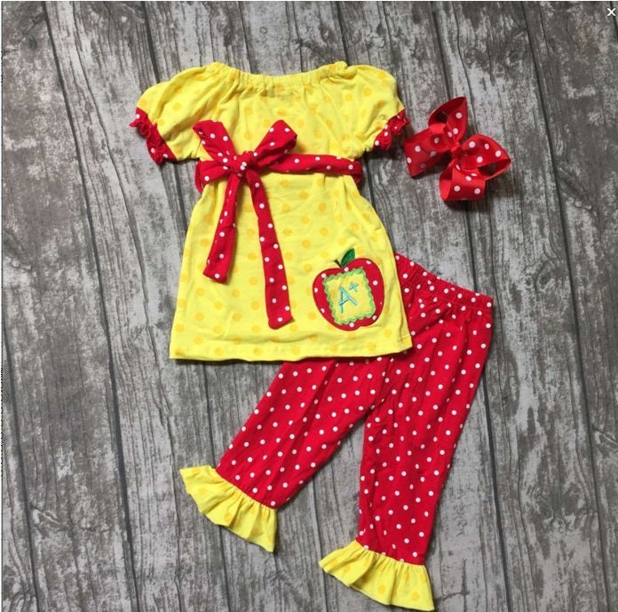 Holy adorable! The cotton in this outfit is super soft, the belt is an adorable touch, and the ruffle bottom pants are the cutest! You can't go wrong for back to school with this one! Bow not included. Please see size chart.