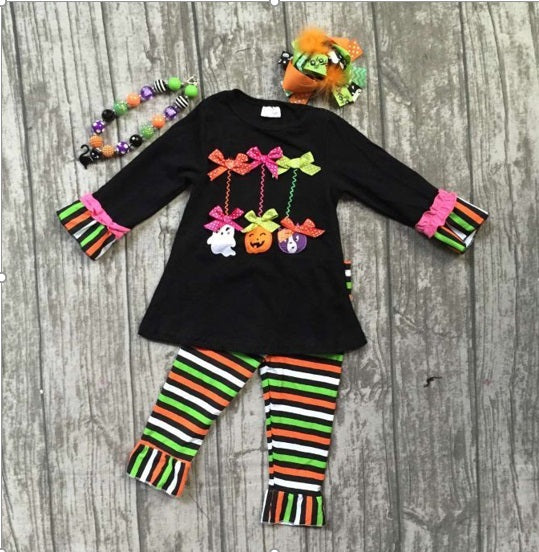 Want something a little less scary and a whole lot of cute! THIS is ADORABLE! Love the slight ruffle pant, these are full length. The colors are super bright and the sewing is great quality. This one is a solid choice. Runs true to size. Please check size chart. Bow and necklace not included.