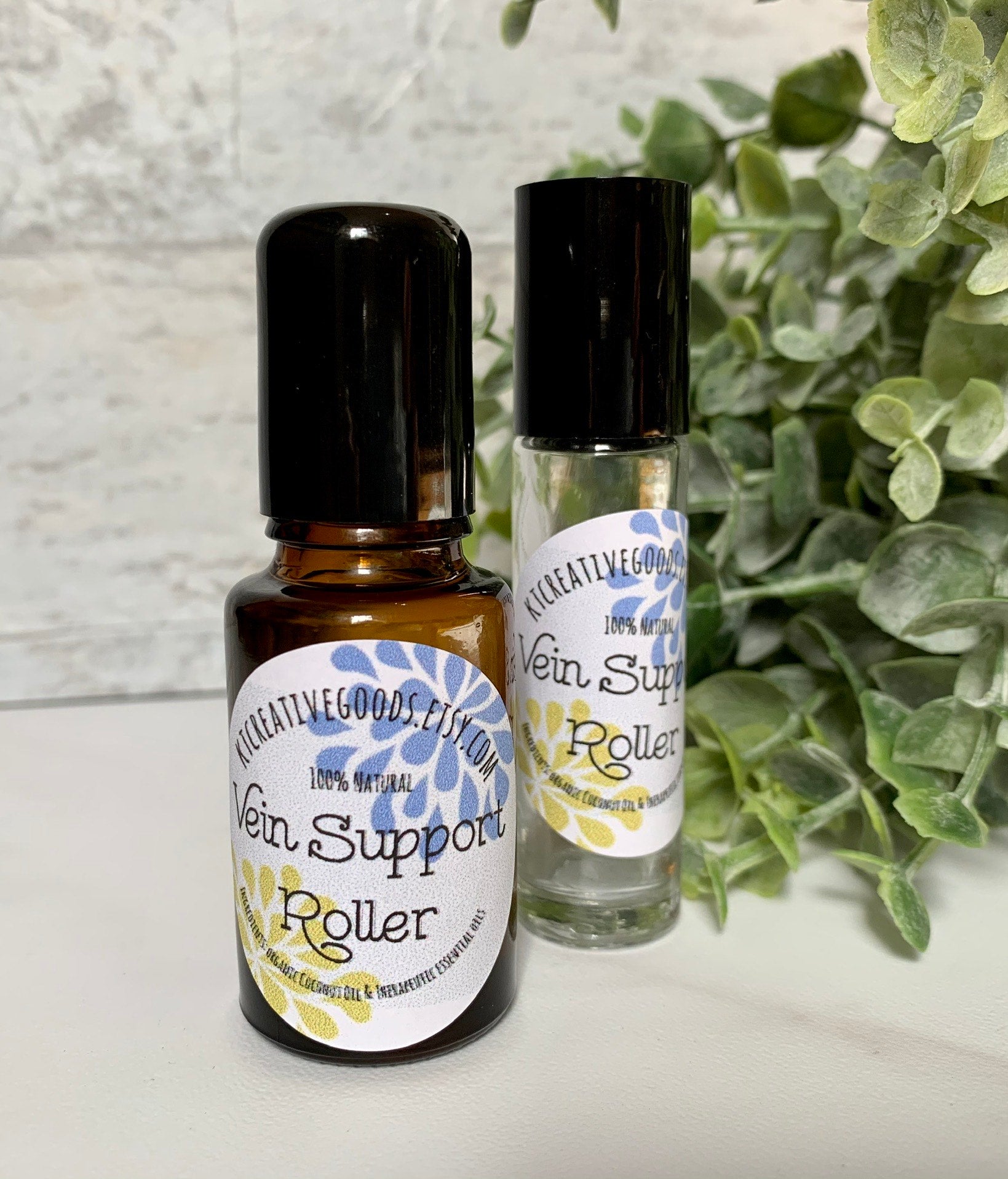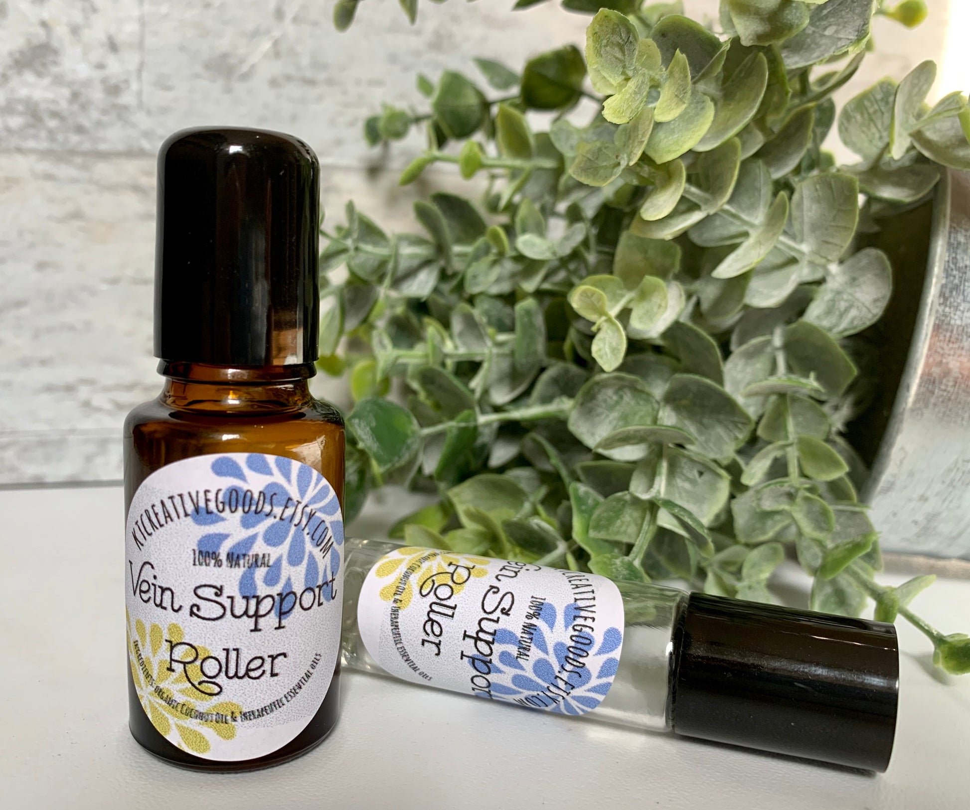 The 'Vein Support' essential oil wellness blend roller was created to help naturally support healthy leg circulation and assist with the discomfort associated with varicose veins.